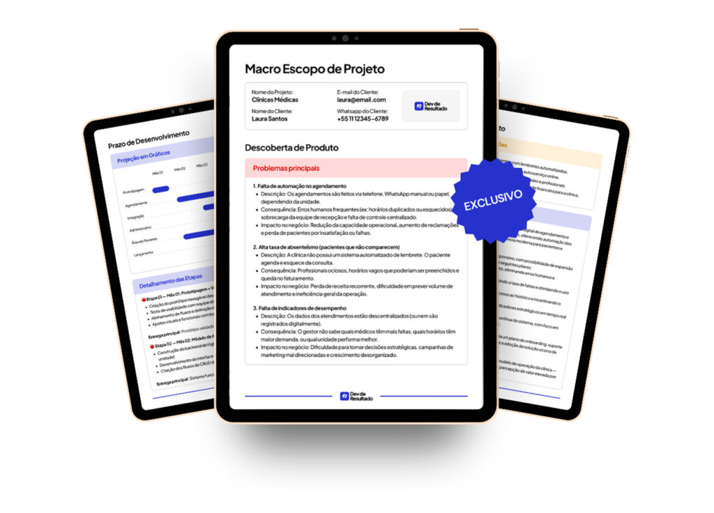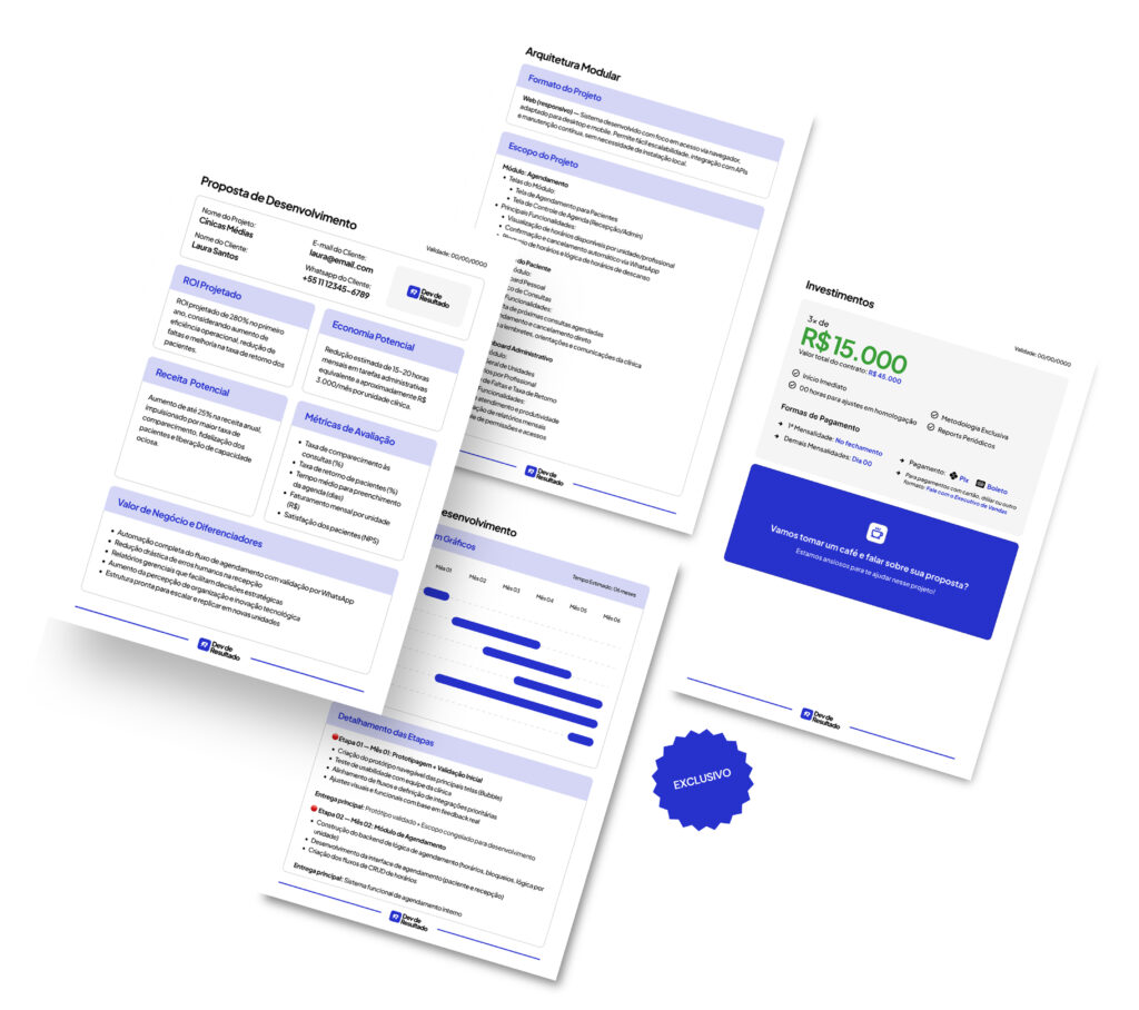 Transforme ideias soltas em projetos estratégicos, com módulos, funcionalidades e cronograma claros — prontos para impressionar qualquer cliente.